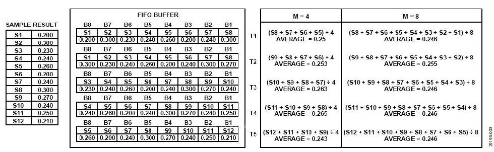 如前所述,滚动平均过采样技术将最新的M个样本相加,并将总和除以M来计算平均值。在图3所示的例子中,M = 4,该算法将FIFO缓冲区中的四个样本B1至B4(这是最新的四个样本)相加,然后除以4。在下一次平均期间,相同的FIFO缓冲位置参与平均,但这些缓冲区中的内容会改变。在M = 8的情况下,FIFO缓冲区中的所有样本都包含在求和运算中,然后除以8。