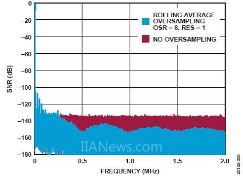 可以看到,本底噪声有显著改善,这与SNR的增加是一致的(参见图6)。在此例中,在使能正常平均过采样和滚动平均过采样的情况下,SNR分别提高到96 dB和95 dB。