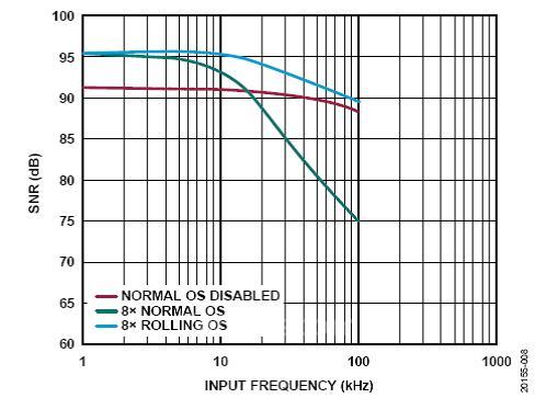 图7.SNR与输入频率的关系,过采样频率响应