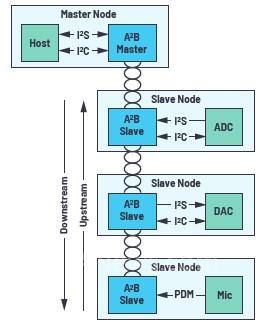 每个网络都由一个主节点和多达10个从节点组成。主节点包含一个连接至主机处理器的A2B收发器,该收发器可以将音频、控制数据 (I2C数据) 发送至A2B总线。从节点的复杂度各不相同(从具备强大处理能力的优质放大器到总线供电的麦克风节点),都可用A2B收发器连接,例如麦克风、数字信号处理器(DSP)、扬声器、传感器(例如加速度计),或者D类放大器。主从收发器器件都支持多种功能,例如支持时分多路复用(TDM)和脉冲密度调制(PDM)麦克风输入。A2B收发器衍生出来的简化产品具备各种级别的功能,例如端点从节点(不支持TDM)、简化型主节点(支持较短的电缆和更少的从节点数量),以及简化型端点从节点(支持较短电缆和更少的PDM输入)。