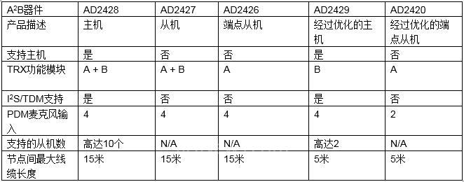 目前面向广泛的市场应用推出了5款通用型A2B收发器,其中两款为主器件,剩余三款为从器件。5款通用收发器包括超集组件和子集组件,以及一款经过优化的端点从器件。支持的5款通用器件概览如表1所示。