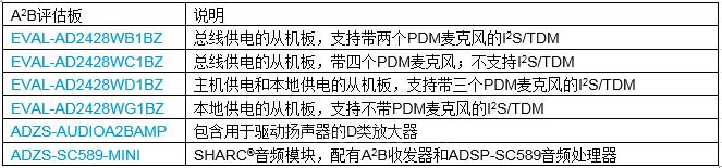 A2B总线由ADI提供的一系列产品评估板提供支持,涵盖各类A2B器件。第三方设计服务团队提供的其他A2B板进一步实施补充。