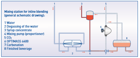 混合设备具有在线混合系统,其中水和糖浆在混合站点中通过比例调节器混合,调节器控制液体的流速和比例。混合在一起后,将成品转移到碳酸化装置。在碳酸化过程中,将所需量的二氧化碳注入过程生产中,使碳酸饮料具有起泡特性。