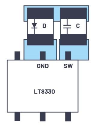 关键回路由外部二极管D、耦合电容C,以及LT8330开关稳压器IC中的GND和SW引脚之间的内部连接构成。热回路应尽量短小和紧凑。