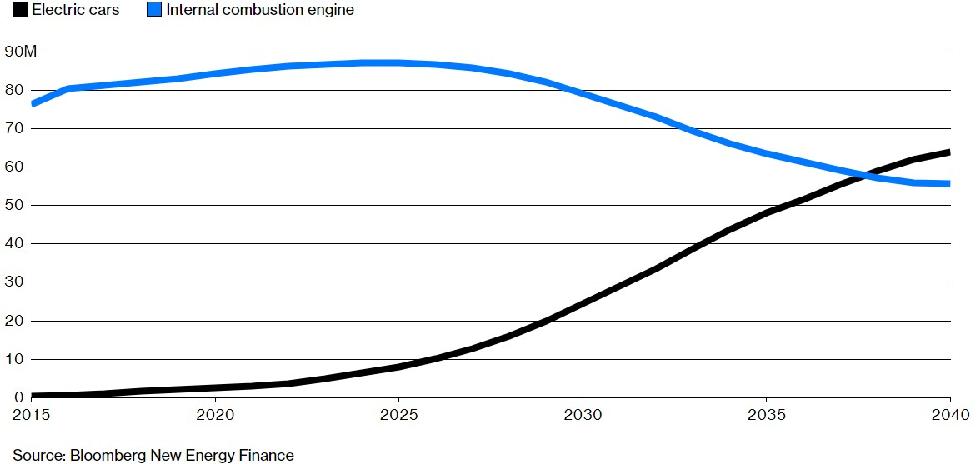 Bloomberg预测,2038年新能源汽车的销量将超过燃油汽车销量
