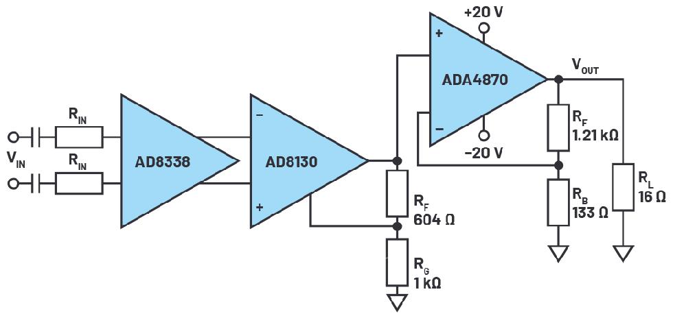 许多商用信号发生器在50Ω(正弦波)负载下提供最大250mW(24dBm)的有效输出功率。但是,这对于具有较大输出功率的应用通常不够用,例如测试HF放大器或生成超声波脉冲之所需。因此,还需要使用电流反馈放大器。ADA4870在±20V电源电压下,可以在输出端以17V的幅度提供1A的驱动电流。它可以在满载情况下生成高达23MHz的正弦波,因此成为了通用任意波形发生器的理想前端驱动器。为了优化输出信号摆幅,ADA4870的增益配置成10,因此所需的输入幅度为1.6V。但是,由于ADA4870具有地参考输入,而上游的AD8338具有差分输出,因此在两个器件之间应连接差分接收器放大器,而实现差分到地参考的转换。AD8130提供270MHz的增益带宽积(GBWP),压摆率为1090V/µs,非常适合这种应用。AD8338的输出限制在±1V,因此AD8130的中间增益应设计为1.6V/V。整体电路配置如图3所示,其可在22.4V(39dBm)幅度和50Ω负载下实现20MHz带宽。