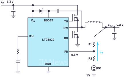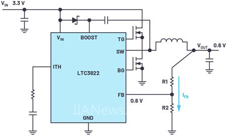 多年以来,线性稳压器和开关稳压器一直采用约1.2 V的反馈电压。此电压由DC-DC转换器IC中的带隙电路产生,它确定了使用外部电阻分压器可以设置的最低电压。到目前为止,大多数现代稳压器IC都可以产生0.8 V、0.6 V甚至0.5 V的输出电压。内部基准电压源也按这种方式设计,所以能够获得更低的电压。图1所示为这种类型的开关稳压器 LTC3822,它以0.6 V的基准电压产生0.6 V的反馈电压。
