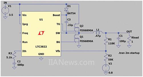 如果要以低于IC制造商指定的输出电压运行线性稳压器或开关稳压器,使用仿真工具(例如ADI的LTspice)进行初始检查是非常有用的。图3显示了一个LTC3822构成的电路,使用额外的电压源作为反馈路径的偏置。在这个电路中,产生一个200 mV输出电压。根据数据手册,LTC3822适用于产生最低0.6 V的输出电压。在电路中,辅助电压源(图3中的电压源V2)可以通过LDO稳压器或基准电压源实现。利用本文所述的技巧,对电路进行完全测试,甚至可能产生更低的输出电压。