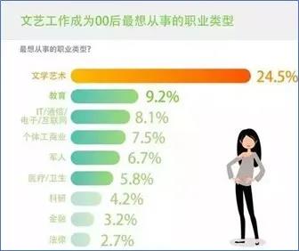 理想职业中,与制造业相关的比例仅10%左右,占比最高的文学艺术类以网红和演员为主。媒体表示00后最有前景的5大职业为:电子竞技、电子竞技、演员、电子商务、设计类、互联网类。