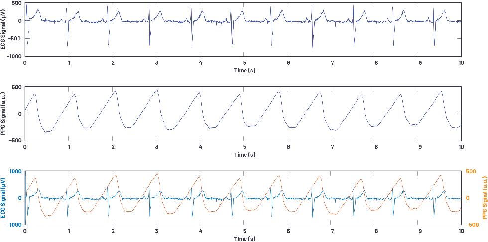集成的时间戳功能可支持来自多个连接传感器的数据样本之间的同步。如需使用多个传感器数据来确定不同测量结果之间的相关性,则需要此功能。图2显示了如何将该芯片用于ECG测量,并与光电容积脉搏波(PPG)测量同步。基于脉冲传播时间(PPT)测量技术,可以连续模式进行血压测量。这对于高血压患者非常有吸引力。时间戳功能使之成为可能。
