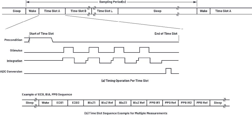 图3b显示了工作时序的示例。上电后,进行复位操作,芯片进入睡眠模式。芯片唤醒后,可以依次采样两个ECG信号(例如,LEAD I和LEAD II),然后进行光学测量以获取SpO2读数,并进行阻抗测量以测量皮肤电导率(EDA/压力)。下面章节将介绍获得这些测量值的过程。