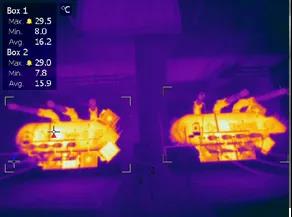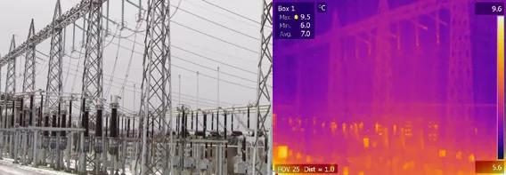 红外热像仪可以监测变压器的关键设备,温度升高表示可能有故障产生