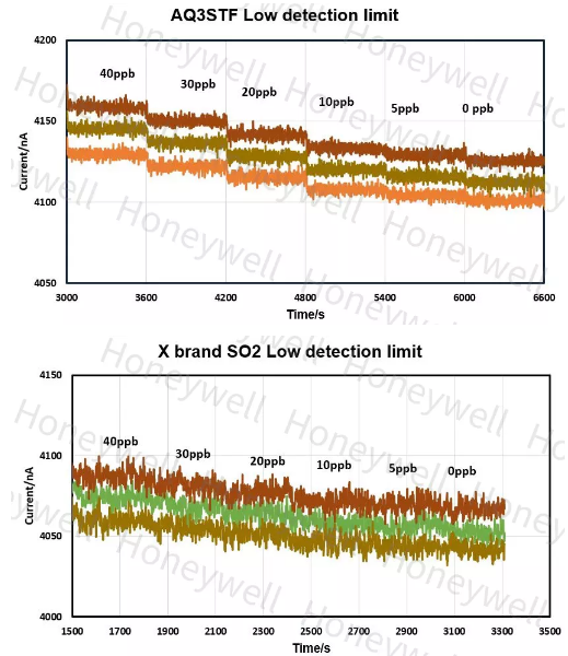 先来看下低浓度检测效果,霍尼韦尔对市面上常见的二氧化硫传感器进行了通气测试,结果发现在0-40ppb范围内无明显台阶,即很难分辨出40ppb以下浓度,且线性较差,这将导致读数准确性差。