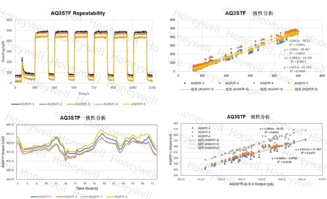 产品一致性对于网格化监测至关重要,一致性好的产品会为仪器厂家大大减轻研发及生产压力,减少后期产品运营及维护成本。测试结果发现,AQ3STF SO2传感器相互间的相关系数R高达0.999,并且随机抽取的样品在室外环境中一致性同样卓越,一致、稳定、可靠才是霍家的风格!