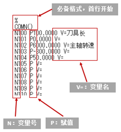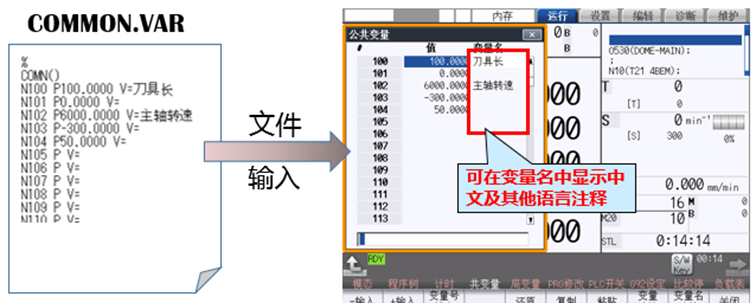 共变量是宏程序的重要组成部分,它能够在宏程序中任意位置通用。在不同类型的数控系统中,共变量的组数因规格而异,可设定其中200点变量名称(#100-#199、#500-#599)。使用中文注释名称,能直观方便的让相关人员了解变量的含义。可以通过文件(COMMON.VAR)设置变量名的中文或其他语言注释(如图1所示)。
