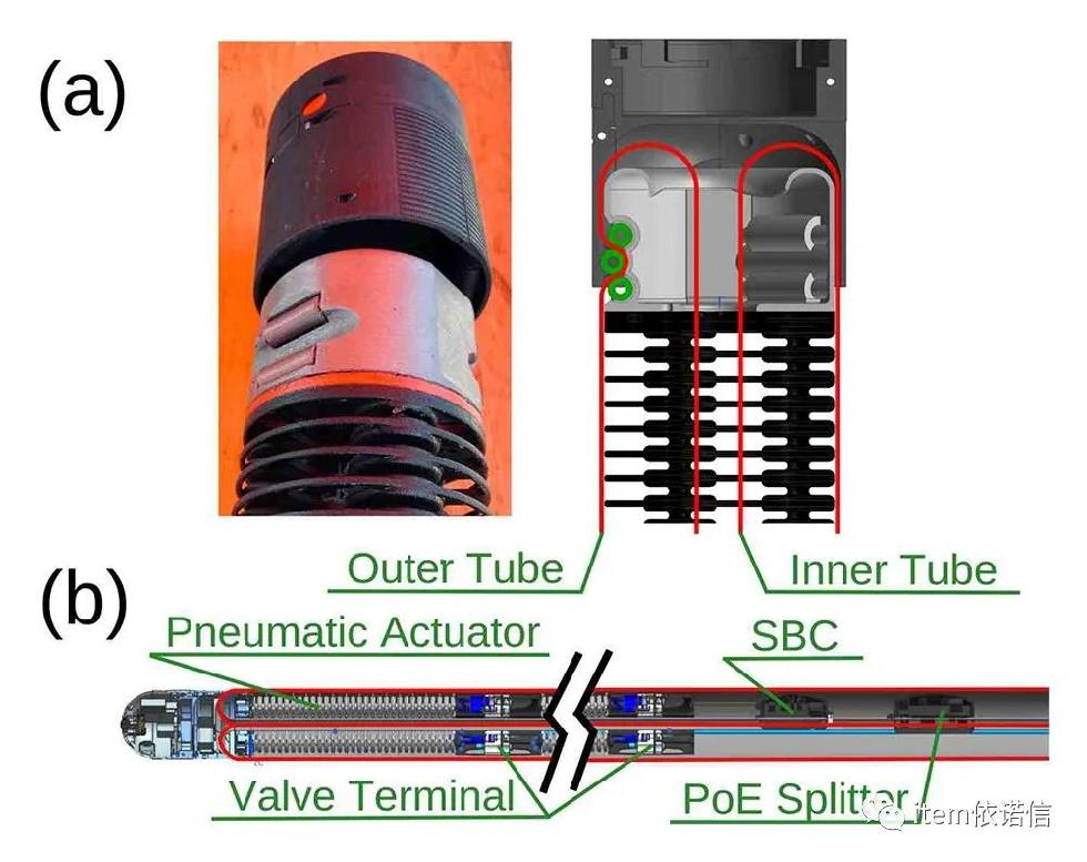 “当尼龙管内部压力增大时,它会外翻,机器人就随之前进。外翻技术最大的优点在于,它可以最大限度地减少摩擦,因为小供气管是在大尼龙管内部移动的。我们采用的是分散式解决方案,机器人的前部使用小的供气管,而电源和数据则使用以太网电缆。然后,内部机器人会负责分配到各个部分。”Haberthür 解释说。