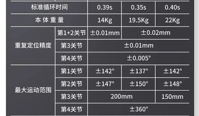±0.01mm与±0.005°的重复定位精度,高效、精准、稳定,标配有组装、搬运、码垛等功能,能够满足绝大数行业的应用场景需求。