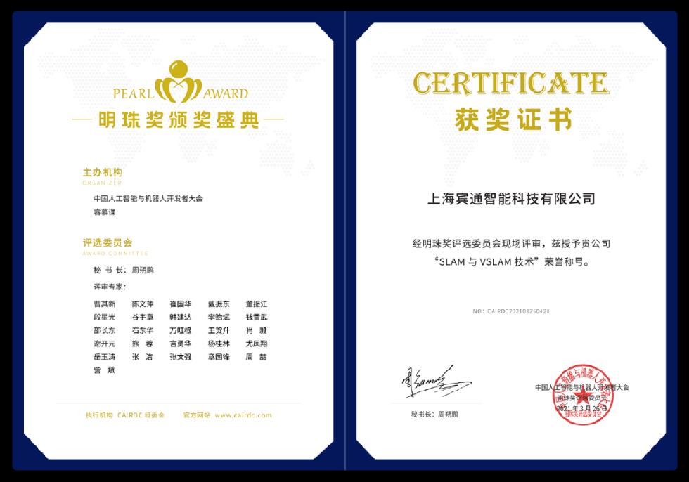 2021年3月26日-27日,以“创新驱动发展 科技引领未来”为主题的第四届中国人工智能与机器人开发者大会暨长三角G60科创走廊洞泾人工智能全产业链大会,在上海盛大召开。宾通智能凭借在SLAM技术上的不断钻研、突破创新及成果转化能力,荣获2021 CAIRDC明珠奖-SLAM与VSLAM技术创新奖,这是对BITO拥有强劲的技术实力、坚持自主研发及商业落地的高度认可。