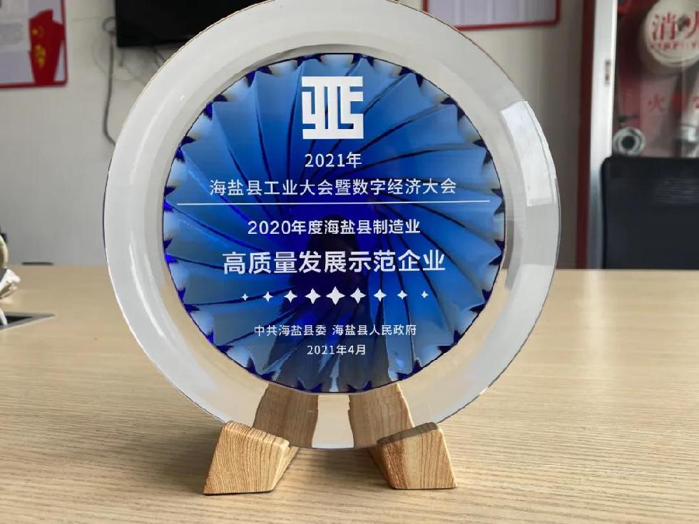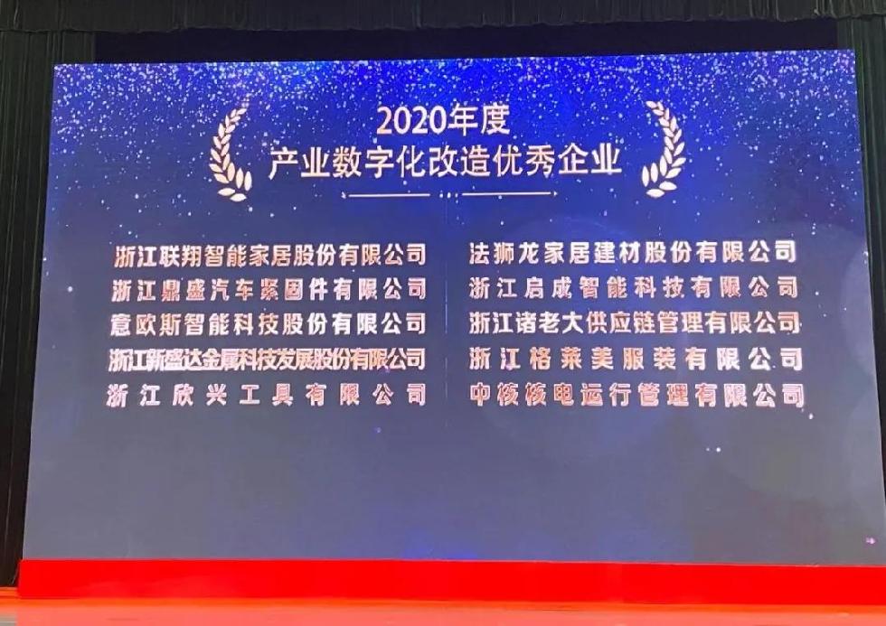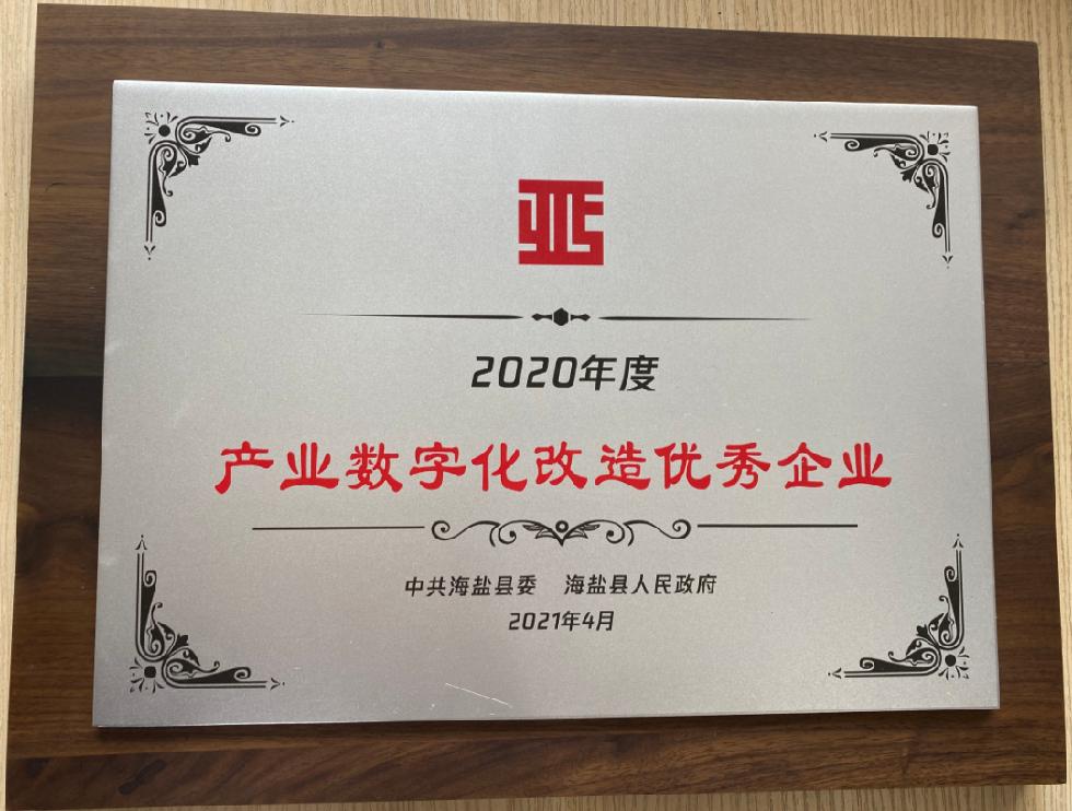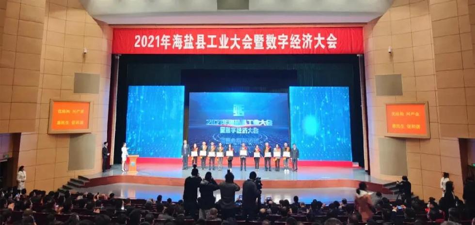 2021年海盐县工业大会暨数字经济大会召开。意欧斯荣获2020年度制造业高质量发展示范企业、2020年度产业数字化改造优秀企业两大奖项。