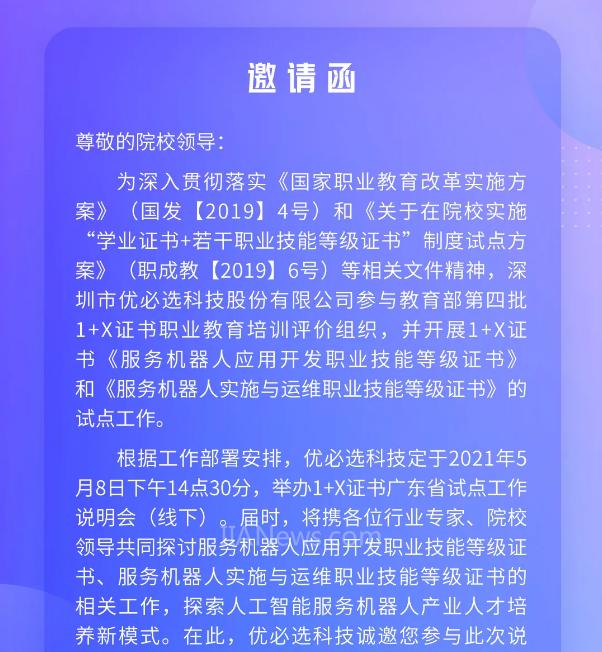优必选科技诚邀您参加「1+X服务机器人职业技能等级证书」广东省试点工作说明会