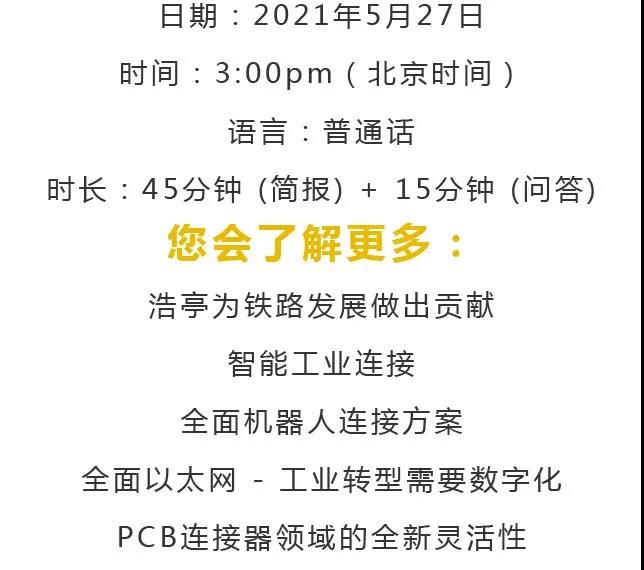 在本研讨会中, 浩亭德国的高级领导也会参与其中,為你解答最新技术。包括浩亭技术集团首席技术官 Kurt D. Bettenhausen 博士, 浩亭电气公司行政总裁 Norbert Gemmeke 先生, 浩亭电子公司行政总裁 Ralf Klein 先生、浩亭定制解决方案公司 (HCS) 行政总裁 Christian Schumacher 先生和浩亭企业传播和品牌总经理 Detlef Sieverdingbeck 先生。