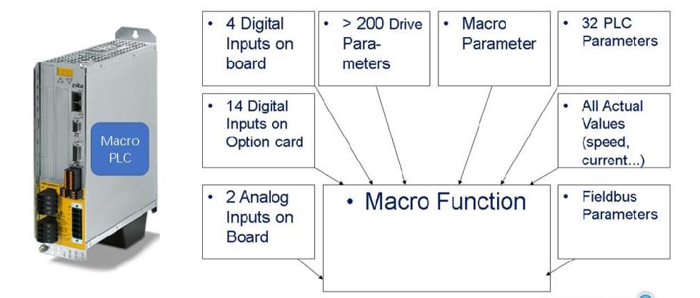Protego D系列伺服驱动器内置的PLC功能称之为Macro program,使用遵循IEC61131的一种结构化文本作为实现语言。它的任务扫描周期最短达62.5µs,其运行环境独立于伺服控制系统和总线功能。它可以独立访问伺服驱动器的几乎所有资源,包括IO数据,伺服控制数据以及总线数据,给予用户最大化的控制自由度和灵活性。