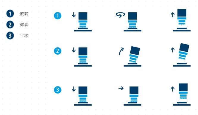 拾取时,ADHESO无源吸附式机械手对工件施加轻柔的压力,从而增加接触表面积。放置时,则可以通过使用以下三种方式与工件分离: