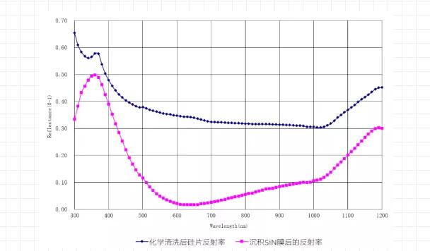 如果在晶硅电池片表面增加一个氮化硅(SiN)涂层,其可以降低表面反射率,进而提升光的发电效率。图2可以看到,通过减反射工序,光的反射率大幅下降。