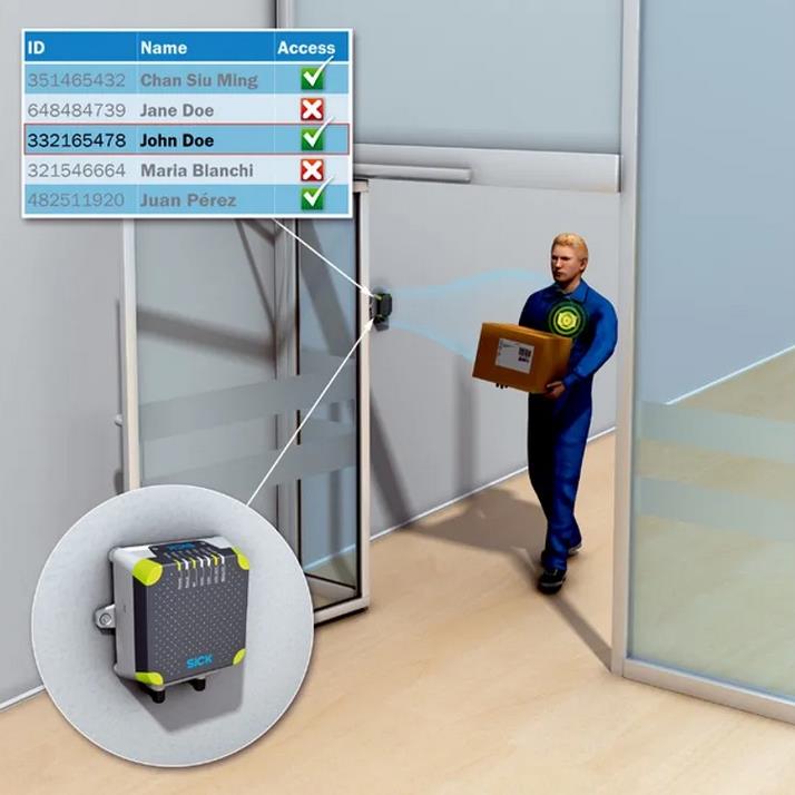 无线射频识别读写器读取经授权人员的应答器并相应放行。由于传感器的大扫描范围,可提前识别人员、非接触式开门。