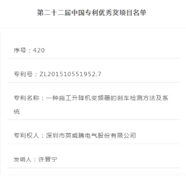 2021年6月25号,由国家知识产权局和世界知识产权组织共同主办的第二十二届中国专利奖获奖名单公布,英威腾的一件发明专利《一种施工升降机变频器的刹车检测方法及系统》(专利号:201510551952.7)荣获中国专利优秀奖。这是继第十九届中国专利奖后,我司第二次斩获国家专利奖项,体现了国家知识产权局对英威腾创新研究能力和知识产权保护能力的巨大肯定和鼓励。