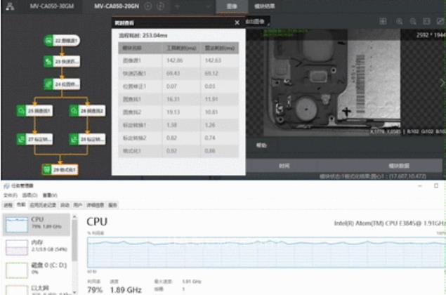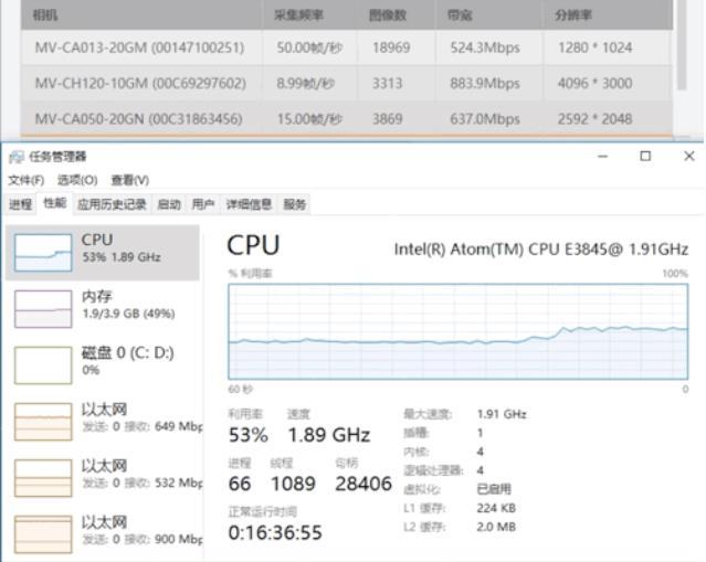 由于在网口满载情况下进行高帧率相机取流,非常消耗CPU和内存,因此我们选择1.3MP(MV-CA013-20GM, 50帧/s),5MP(MV-CA050-20GN, 15帧/s),12MP(MV-CH120-10GM, 9帧/s)同时进行取流测试,VB2200展现出CPU占用率55%左右,内存占用约2G的优异表现!