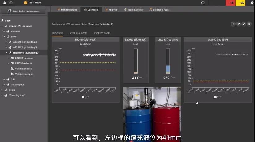 此次直播也以某树脂铸造厂进行应用演示,从而便于大家有更直观的了解。当对该厂的两个装有铸造树脂的桶的填充液位进行监测时,传统的方式是当达到特定的填充液位时,液位传感器的红色信号灯就会亮起并闪烁,需要生产人员在现场看到后进行相应处理。现今,这2个液位传感器信息将直接发送至IO-Link主站。而moneo平台可以直接检索和查看该IO-Link主站的传感器数据。