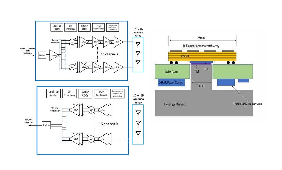 SPEKTRA的核心部件为Metawave的MARCONI™ 77GHz多通道波束成形器芯片,当与Metawave的专有校准系统配合使用时,可以在目标视场内以精确的步骤控制发射和接收波束范围。MARCONI采用天线封装(AiP),能够在运行高级虚拟输入输出阵列(Virtual MIMO Array)算法的同时,控制聚焦的高增益波束,从而使基于SPEKTRA雷达的平台比传统的纯数字雷达更具优势。传统雷达,又称“片上雷达”,使用的是较宽、增益较低的波束,从根本上无法实现与SPEKTRA相同的等效全向辐射功率(effective isotropic radiated power,EIRP)和距离性能。 AiP模块遵循商业毫米波产品(尤其是无线蜂窝市场)的最新趋势,将Marconi芯片与AiP组装和封装,从而可凭借完全校准的模块化构建块实现更高的集成度,并提高性能。其中,模块化构建块可配置于天线阵列,从而驱动Virtual MIMO Array算法。此外,这些构建块还可用于各种几何形状和拓扑结构,以开发用于多功能用途的专用雷达模块。