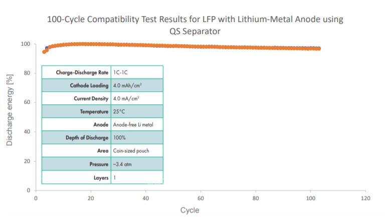QuantumScape还正在为其锂金属电池测试磷酸铁(LFP)阴极:“我们使用低成本的磷酸铁(LFP)阴极制作和测试了无阳极锂金属电池,并确认化学和电池设计可与LFP兼容,如下图所示。LFP已重新引起人们的兴趣,但使用碳阳极的传统LFP电池通常存在能量密度低的问题(约为400 Wh/L)。相比之下,我们认为将LFP与QS的锂金属阳极结合可以提供600至700 Wh/L的能量密度,这几乎接近当今最先进的NMC化学。”