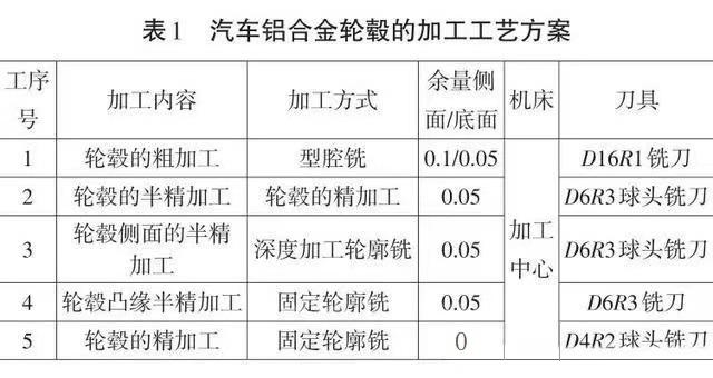 铝合金轮毂毛坯采用锻造工艺, 零件毛坯基本已经成型, 只需要进行对轮辋和轮辐的设计, 根据轮辋和轮辐尺寸和造型的不同完成加工, 定位采用以轮毂底面为基准, 以轮毂顶面中心为加工坐标系, 并作为Z0的起点位置, 用专用夹具进行装夹, 用百分表完成汽车铝合金轮毂的X、 Y方向的找正。加工工序步骤是先进行粗加工, 再进行半精加工和精加工。主要的加工工序安排如下:粗加工型腔铣→半精加工型腔铣→精加工深度加工轮廓铣→精加工固定轮廓铣, 采用螺旋下刀的走刀方式, 避免跳刀和空走刀加工。汽车铝合金轮毂主要是由曲面和圆弧面组成。铝合金轮毂采用高速钨钢刀进行加工, 刀具选用 ϕ 16R1mm、ϕ 6R3mm、 ϕ 4R2mm和 ϕ 1R0.5mm的圆角刀和球头刀。粗加工为了加工效率可以选用 ϕ 16R1mm的机夹刀,刀粒磨损安装新刀片比较快捷方便。半精加工和精加工采用球头刀加工, 可以达到很高的表面粗糙度。加工思路是先通过型腔铣进行粗加工,侧留0.1mm加工余量, 底面留0.05mm的余量。加工工艺方案如表1所示,再利用深度加工轮廓铣和固定轮廓铣进行半精加工和精加工。避免振动可采用较小的吃刀量为0.5mm,主轴转速选取4,500转/min, 进给率2,500mm/min, 精加工主轴转速选取5,500转/min, 进给率2,800mm/min, 吃刀量采用为0.4mm。具体切削用量明细表如表1所示 。