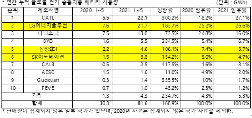 近日,韩国研究机构SNE Research发布数据显示,2021年5月,全球注册电动汽车的动力电池装机量为19.7GWh,同比增长232.5%。其中,LG新能源的动力电池装机量同比增长270%至5.7GWh,市占率升至28.7%,超越宁德时代位列第一。而宁德时代的电池装机量为4.8GWh,同比增长近260%,市场份额为24.5%,排名降至第二。