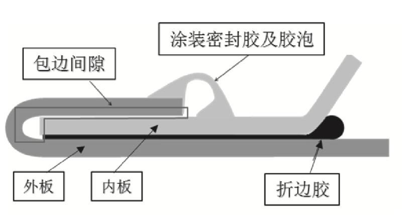 汽车门盖类零件一般采用包边工艺,如图2所示,通过包边或滚边方式将门盖外板折弯压实,为了防止门盖内外板攒动,会在内板和外板结合部位涂折边胶。涂装电泳后,在外板和内板的结合部位涂PVC密封胶,以防腐和保证美观。