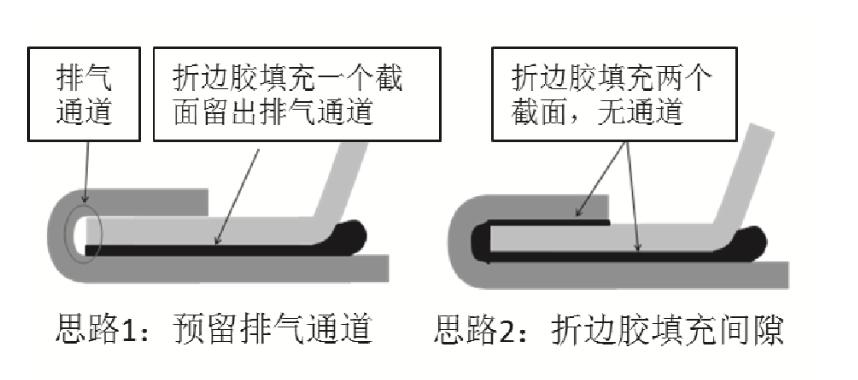 针对外板包边面与内板之间存在水和空气问题,有两种解决思路。一是留出排气通道,使加热膨胀的水蒸气和空气从排气通道及时排除,避免腔体内气压升高,思路1如图3所示。二是折边胶完全填实内板与外板搭接的上下面,阻断电泳液渗入包边间隙内,形成无空腔的环境,思路2如图3所示。下面我们沿着上述2种思路进行原因分析和措施优化。