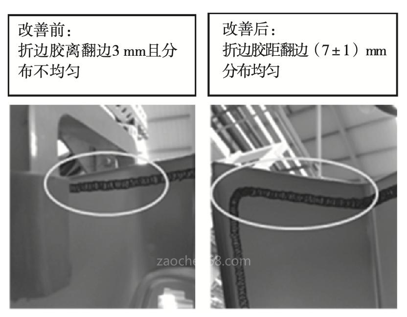 首先,折边胶位置优化 :控制涂胶位置距离外板翻边面一定的距离,确保内外板压合后被挤压的折边胶不会溢出至排气通道,同时涂胶胶型分为螺旋胶和直线胶,螺旋胶的胶量相对直线胶多,因此在设定边距的时候需距离增大。以螺旋胶为例,一般设定折边胶距离外板翻边(7±1)mm为宜,改善案例如图4所示。