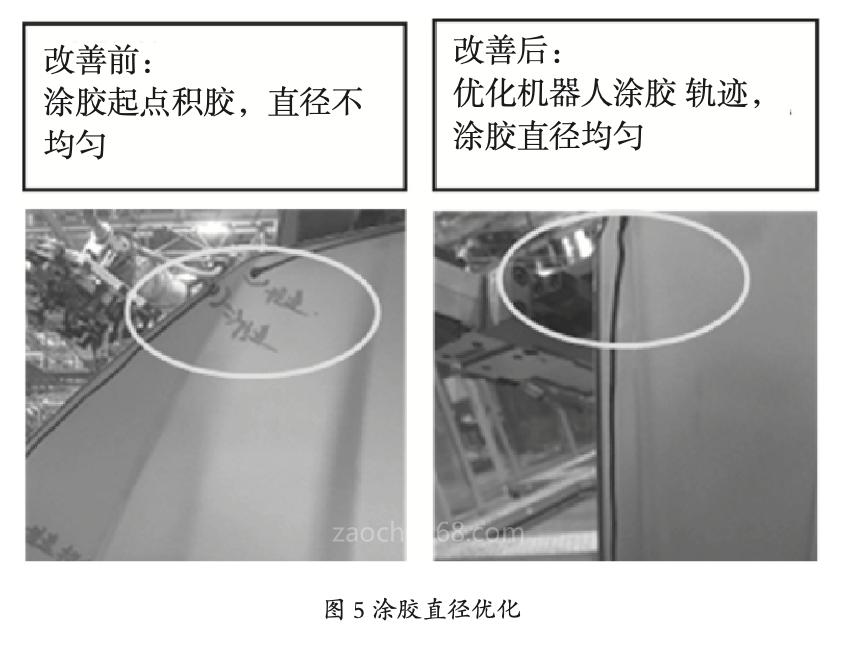 其次,涂胶直径优化,通过调整机器人轨迹和速度,避免涂胶起点和收尾点由于胶枪的压力发生突变,形成堆积现象。胶堆积处内外板压合后折边胶会堵塞排气通道,形成密闭腔体。可以通过调整机器人涂胶速度和涂胶设备压力参数控制出胶速度。涂胶直径优化如5所示。