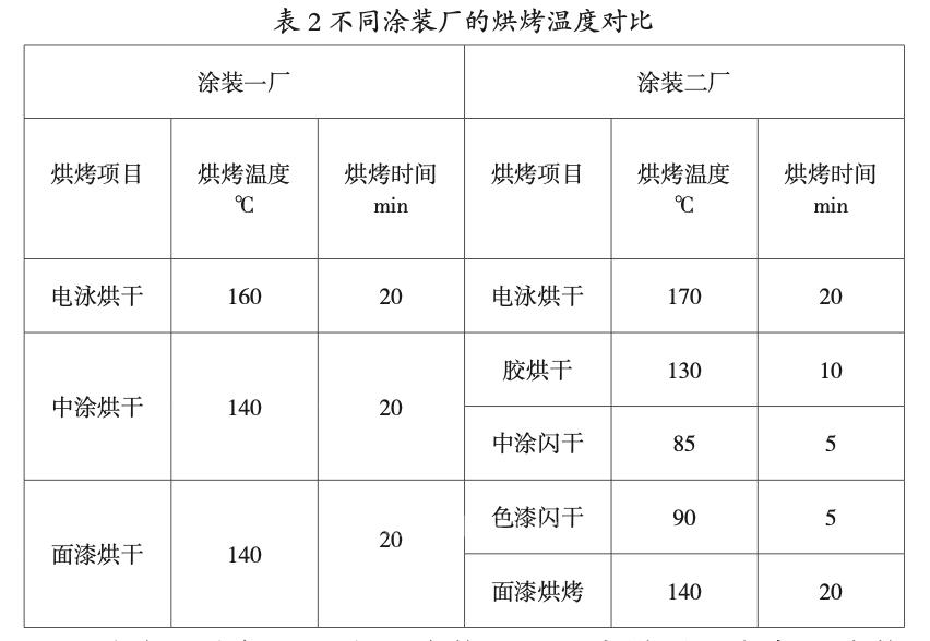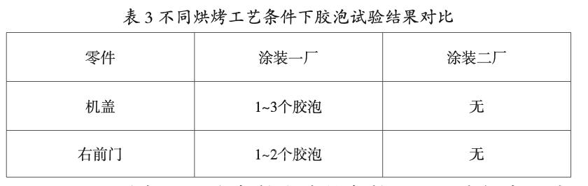 通过对比2个不同工艺涂装厂烘烤温度条件下的结果,对于采用同一套涂胶轨迹的机盖和右前门进行验证,烘烤温度对胶泡形成可以起到调节和优化的作用。不同涂装的烘烤温度对比见表2。