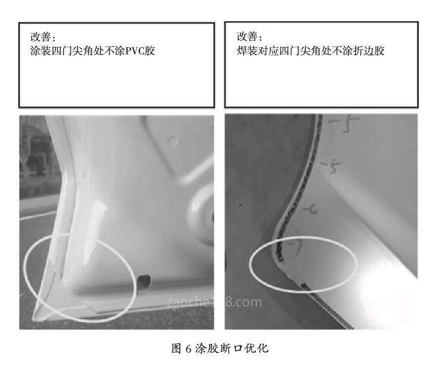 再次,局部断胶:涂胶直径、位置同时受过程因素影响,如气温、折边胶黏稠度、设备等诸多不稳定因素影响,为此适当增加一些断胶口以便空气顺利排出,特别是通过调整涂胶位置和涂胶量的情况无法彻底解决的部位,可以适当考虑折边胶断胶,或在容易起胶泡的尖角部位不涂PVC胶,如图5所示。为了分析原因和判断优化的结果,可以将包边后的门总成外板边缘R角打磨切开检查排气通道是否堵塞。
