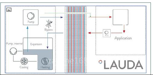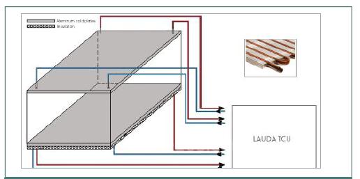 通过连接一个换热器如板式换热器或者列管换热器到TCU上,电池测试包中的第一级换热液体可以在外部温控探针Pt 100的辅助下被控制到所需要的温度。第二级回路中的导热液体泵入和泵出LAUDA的TCU,通过基于Pt 100测到的温度提高和降低其温度。这样的结果就是直接处理电池包的导热液体会稳定在测试单元所需要的温度。