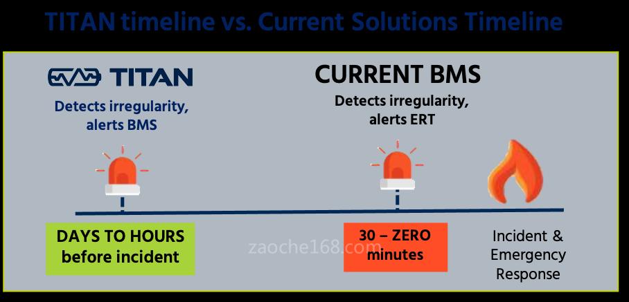 现有电池管理系统,在发生火灾或其他危险前的几分钟或几秒钟,才会发出警报,往往来不及阻止危险发生。泰坦公司的预警系统使用经过验证的超声波技术,可以实时检测异常和有害的电池状况,并在发生危险的前几小时或几天内,生成可操作警告。其中可能包括热失控,这是电池内部的连锁反应,一旦启动就很难停止。