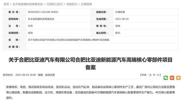 近日,一份来自合肥市长丰县发改委的项目备案信息显示,合肥比亚迪汽车有限公司新能源汽车高端核心零部件项目已分别于8月2日、3日完成备案,该项目建成后具备40万辆新能源汽车高端核心配套零部件生产能力。据悉,项目将于 8 月底开工建设。