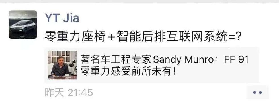 7月25日,贾跃亭在其微信朋友圈分享了一条名为《著名车工程专家Sandy Munro:FF 91零重力感受前所未有!》的视频链接,并配文:零重力座椅+智能后排互联网系统=?由此可见,在贾跃亭看来,二者可谓是FF 91的核心黑科技。那么,这两项技术究竟有多强?
