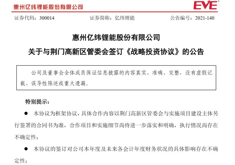 需要指出的是,在此之前,亿纬锂能于6月10日与荆门高新区管委会签订了战略投资协议。公司及其子公司拟在荆门掇刀区投资建设年产104.5GWh的新能源动力储能电池产业园(含已建成产能11GWh、在建产能11GWh和拟再分期投资建设的产能82.5GWh),并根据生产需求引入锂离子动力储能电池配套产业。