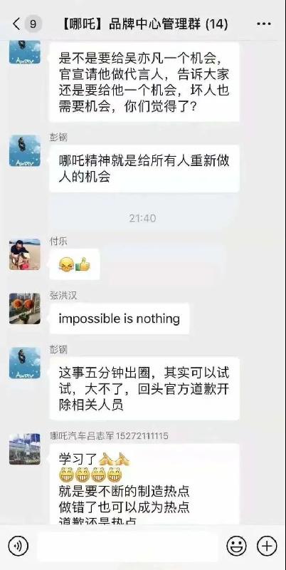 在网传的聊天截图中可以看到,哪吒汽车市场负责人彭钢不仅提出了“要给吴亦凡一个机会”,同时还将其与品牌相结合,表示“哪吒精神就是给所有人重新做人的机会”。