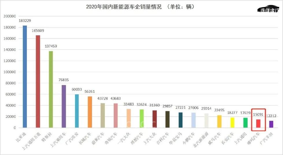 据乘联会数据显示,2020年国内新能源车企销量排名中,比亚迪、上汽通用五菱和特斯拉分别以183229辆、165609辆和137459辆排在第一至第三位,蔚来、理想和小鹏也依次以43728辆、32624辆和27006辆分据第七、九和十四位。