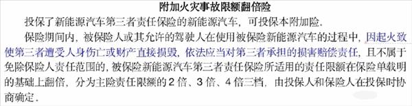 为此,针对新能源汽车的火灾事故,特别推出有火灾事故限额翻倍险。新能源汽车因起火只是第三者人身伤亡或者财产直接损毁,依法应对第三者承担的损害赔偿责任,且不属于免除保险人责任范围的,被保险新能源汽车第三者责任保险所适用的责任限额在保险单载明的基础上翻倍,分为主责任限额的2倍、3倍、4倍三档,由投保人和保险人在投保时协商确定。按照当前三责险最高1000万元的保额来计算,新能源汽车的火灾事故限额翻倍险,最高可以翻4倍,投保4千万元的保额,满足车主因火灾赔付的理赔需求。